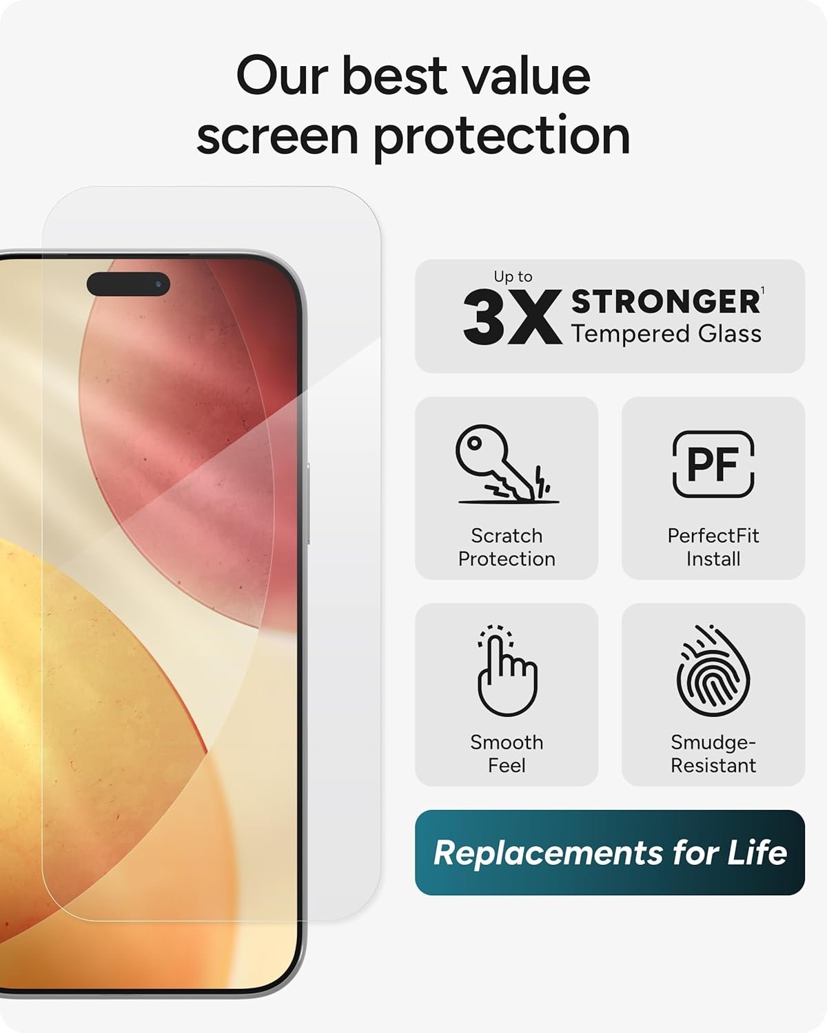 Protect your iPhone 17 Pro Max with the ZAGG Glass+ Screen Protector, engineered to be 3X stronger than standard glass for superior impact and shatter resistance. This InvisibleShield protector maintains a silky-smooth feel and crystal-clear display, while advanced scratch and oil-resistant coatings keep your screen looking pristine. Thanks to ZAGG's Easy PerfectFit installation, achieving flawless protection at home is hassle-free. Choose ZAGG for unbeatable durability and peace of mind for your device.